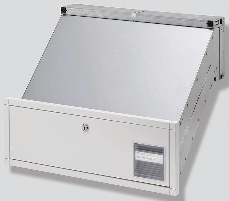 Gehäuse für die Unterputzmontage. Rückseitige Entnahmetür in weiß, nach unten aufgehend, mit Zylinderschloss, Namensschild und Informationsfenster. Geeignet für Mauereinbau (trockenes Mauerwerk) aus feuerverzinktem Stahlblech 0,8 mm, in schräger 45°-Ausführung, ausziehbar von 290 bis 440 mm.