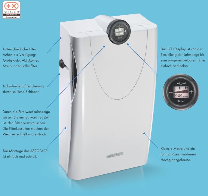 Der Schalldämmlüfter AEROPAC passt mit seinen kompakten Abmessungen in jeden Raum. Er ist sparsam im Stromverbrauch und läuft ruhig. Die hohe Schalldämmung reicht auch an stark befahrenen Straßen, Bahnstrecken und im Flughafenbereich aus. Die seitlich angeordneten Lüftungsöffnungen ermöglichen einen zugfreien, gleichmäßigen Frischluftstrom.