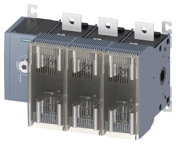 Lasttrennschalter mit Sicherung 630A, Baugr. 5, 3-polig für NH-Sicherung Gr. 2 und 3 Frontantrieb links Grundgerät ohne Handgriff Flachanschluss Lasttrennschalter mit Sicherungen 3KF als Haupt- , NOT-AUS- oder Reparaturschalter. Lasttrennschalter mit Sicherungen 3KF ermöglichen je nach Baugröße das Ein- und Ausschalten eines Bemessungsstroms zwischen 32 und 800 A. Darüber hinaus bilden sie eine Sicherheitstrennfunktion in allen Niederspannungs-Stromkreisen. Lasttrennschalter mit Sicherungen 3KF sind optimiert für anspruchsvolle Anwendungen, bei denen NH-Sicherungen eingesetzt werden. 1. Variabel einsetzbare Lasttrennschalter mit Türkupplung oder Direktantrieb in fünf Baugrößen. 2. Einfaches Nachrüsten von Funktionen durch umfangreiches Zubehör. 3. Zuverlässiger Schutz vor Stromunfällen durch Abschließfunktionalität, Berührungsschutz und automatisch verriegelte Sicherungsabdeckung im eingeschalteten Zustand. 4. Robuste Technik mit hoher Kurzschlussfestigkeit für hohe Anlagenverfügbarkeit. 5. Schnelle Montage an der Hutschiene bei Baugrößen bis 80 A. 6. Effizientes Engineering mit umfangreichen CAx-Daten. 7. Sicherer Schutz auch für Windkraftanlagen bis 690 V + 10%.