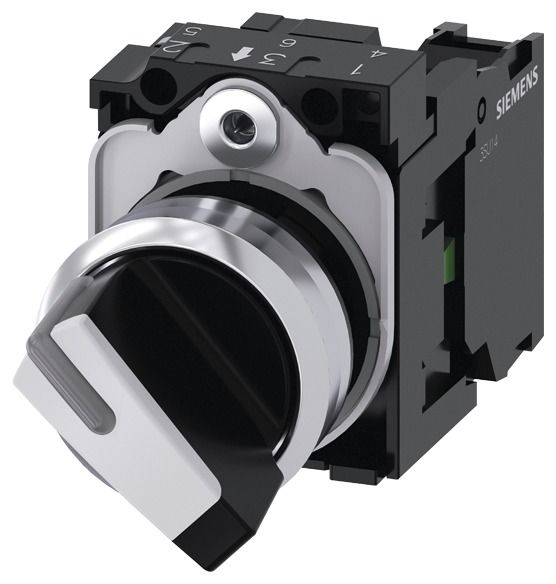 Knebelschalter, beleuchtbar, 22 mm, rund, Metall, hochglanz, weiß, Knebel, kurz, 2 Schaltstellungen O-I, verrastend, Schaltwinkel 90°, 10:30h/13:30h, mit Halter, 1S, Schraubanschluss Knebelschalter SIRIUS ACT zur Schaltung und Steuerung elektrischer Verbraucher.Unter dem Markennamen SIRIUS ACT bietet Siemens ein einzigartiges Portfolio an Befehls- und Meldegeräten mit weltweiten Produkt-Zulassungen in drei modernen Designreihen aus robustem Echtmetall und hochwertigem Kunststoff.Das innovative Aufschnappkonzept vereinfacht die Montage so weit, dass dafür nur eine Hand und kein Spezialwerkzeug erforderlich ist. Als Montagebohrungen genügen nutfreie Löcher, da bereits ein 100%iger Verdrehschutz integriert ist.Dank der durchgängig hohen Schutzart sind die robusten Geräte industrietauglich und für den Außeneinsatz geeignet. Sogar die Reinigung mit Hochdruckstrahl ist möglich. Weder Staub, Öle noch aggressive Laugen können den zuverlässigen Betrieb stören.Neben der Standardverdrahtung können die meisten Geräte auch über PROFINET, AS-Interface oder IO-Link an die Steuerung angebunden werden. Damit reduzieren Sie Ihren Verdrahtungsaufwand, minimieren Fehlerquellen und gewinnen mehr Flexibilität.Komfortabel unterstützt der grafische Online-Konfigurator bei Auswahl und Bestellung von Einzelgeräten, Gehäusen und Beschriftungen. Umfangreiche Dokumentation (z.B. Handbuch, 3D-Daten, Anschlussdiagramm) ist verfügbar.Lieferbare Ausführungen: mehrere Farben, 2-4 Schaltstellungen, kurzer/langer Knebel oder Drehknopf, beleuchtet/unbeleuchtet (Beleuchtung auch nachrüstbar), verrastende/tastende Betätigung.Hinweis: Komplettgerät, Lieferung inklusive Halter und Module.SIRIUS ACT - Performance in Action beim Befehlen und Melden. Einfach montiert, einfach stark, einfach perfekt.