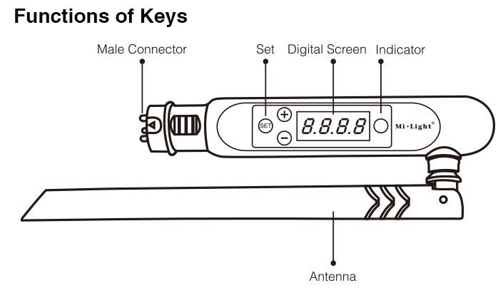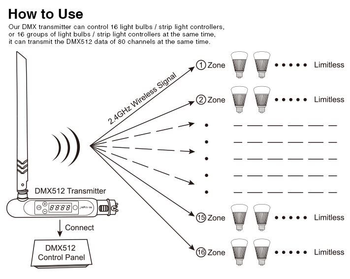 Product Name: DMX 512 LED Transmitter Model No.: FUTD01 Voltage: DC5V-500mA Frequency: 2400-2483.5MHz Transmitting Method: GFSK Power: 6dBm Distance: 30m Size: 188*47*23mm