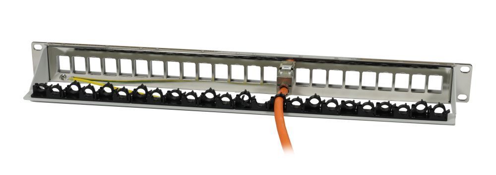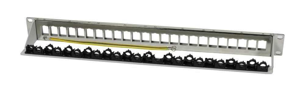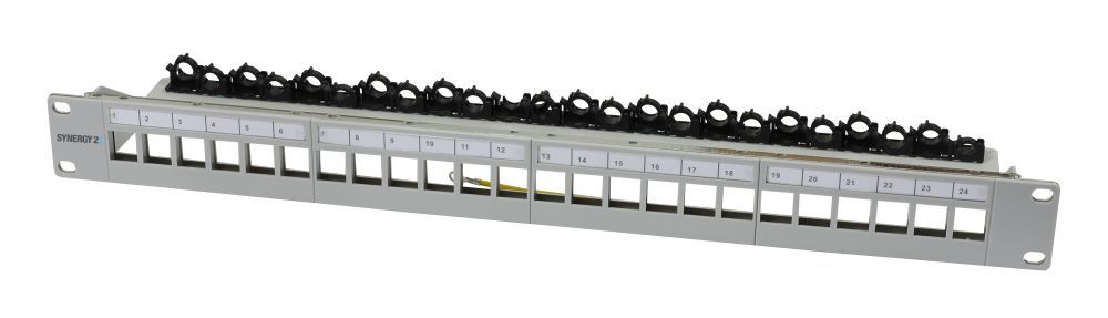Passendes Zubehör für Keystone, Modulträger, 48,3 cm ( 19 Zoll )Patchpanel für 24xTP-Modul, 1HE(t 94mm), Lichtgrau, V4 mit Kabelklemme, Synergy 21,