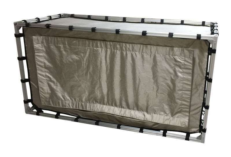 An der Seite des Zeltes befinden sich ein Netzfilter (optional für die 86cm-Variante), zwei AC/DC-Filter und vier Koaxialanschlüsse. Die Öffnung des Zeltes wird mit einem leitfähigen Klettverschluss verschlossen.