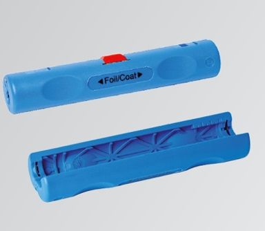 Abmantelwerkzeug zum Absetzen des Kabelmantels und der Metallfolien eines Datenkabels. Farbe blau. Verpackungseinheit: 1 Stück Verkaufseinheit: 1 ST.